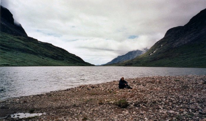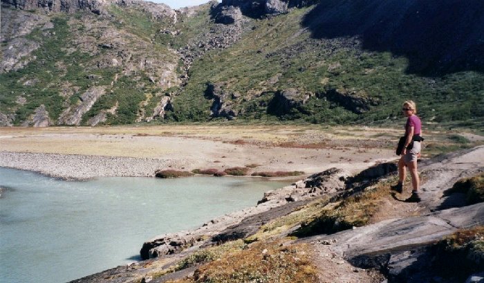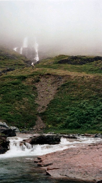 The rain had just ended and we have reached the upper end of Sarfannguit Ilua, a big delta forced us to do a lot of fording. I didn't mind walking into the rivers. A bummer! The GoreTex membrane in my boots had cracked so my feet got wet. The waterfall in the background was the one near our previous camp.