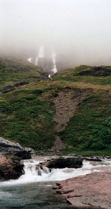 These impressive waterfalls are situated near the massive called Nunasarmaq (Strygejernet - the iron) and flows into Sarfannguit Ilua. The weather was very windy and it was raining -so the top of the waterfalls was not visible.