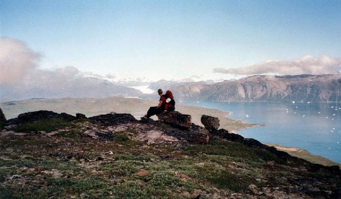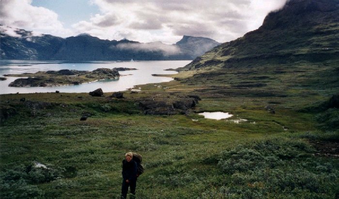 On the next day before the decent to Sillisit we took the time to enjoy the view. The fjord in the middle of the picture is Qooqqut -the target for one of our day walks when we were in Igaliku. Actually the plateau at the right side of the picture under the clouds was the one where we took a picture in this direction.