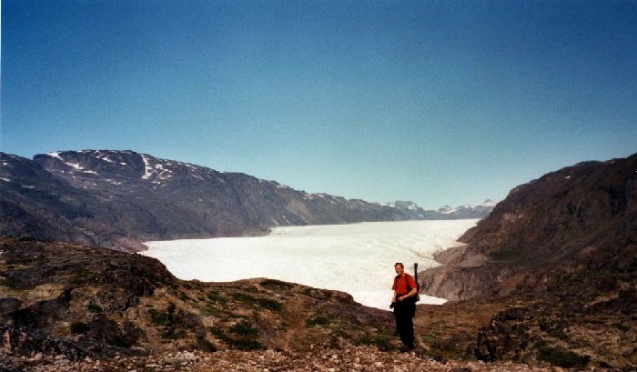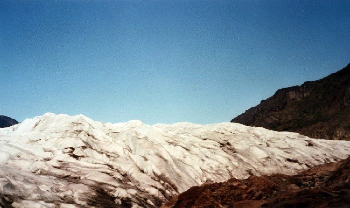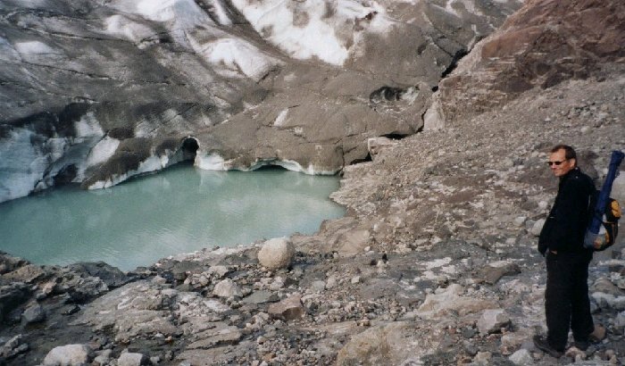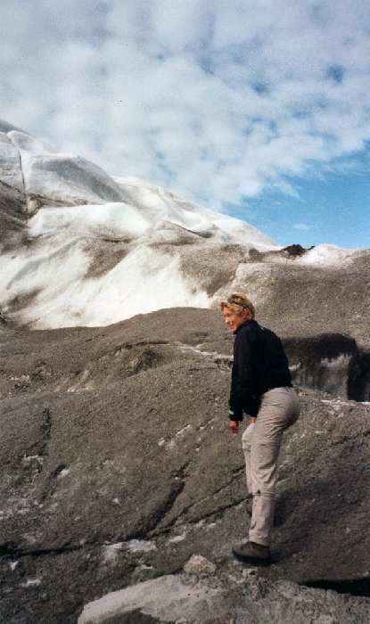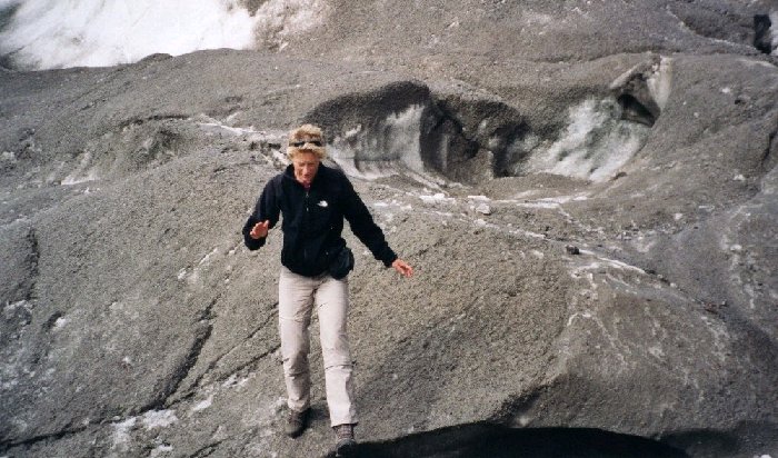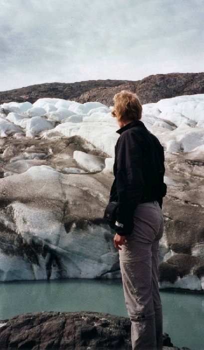 With extreme care we tried to stand on the glacier. Melting water can undermine the glacier so that it breaks up when you stand on it.