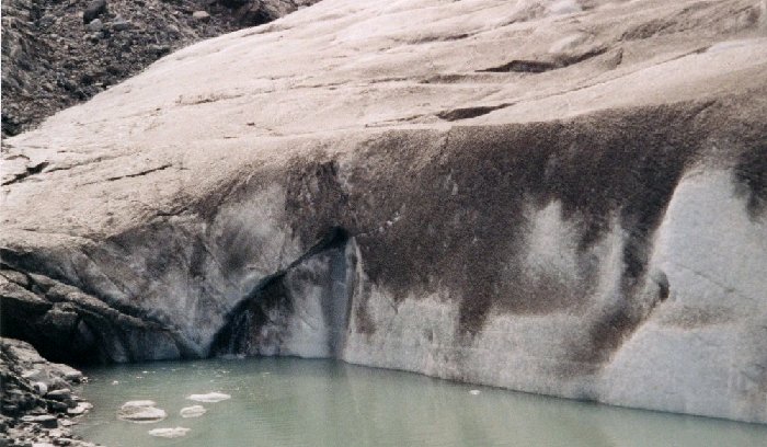 The water is green/gray due to the sediments from the melting water.